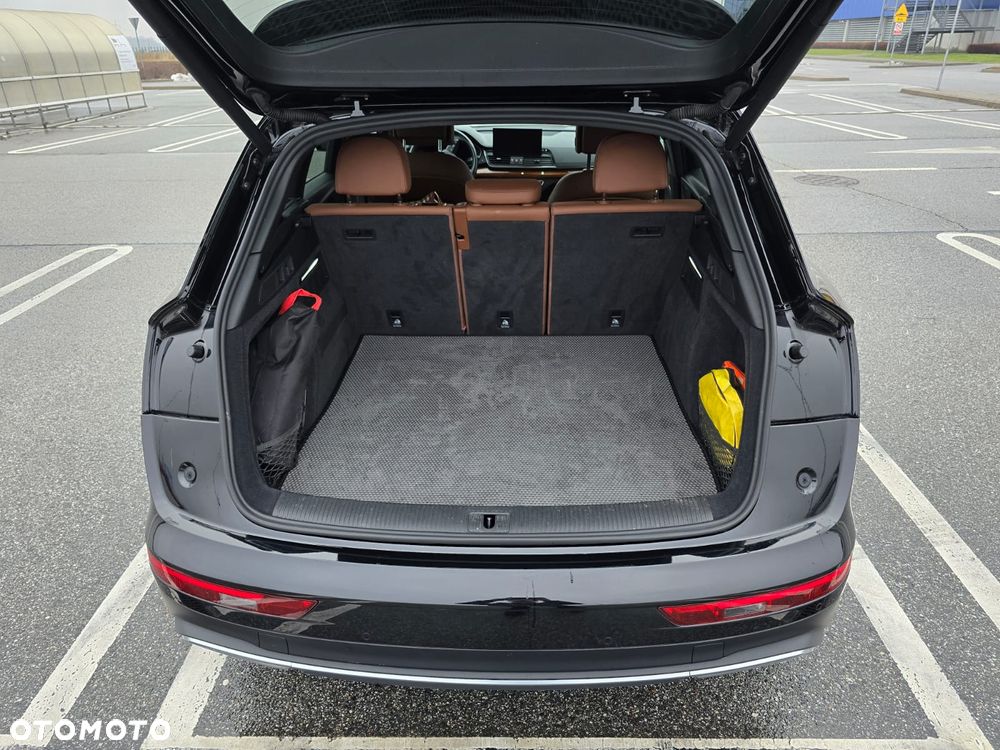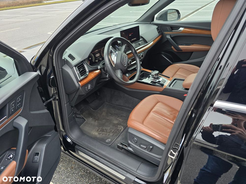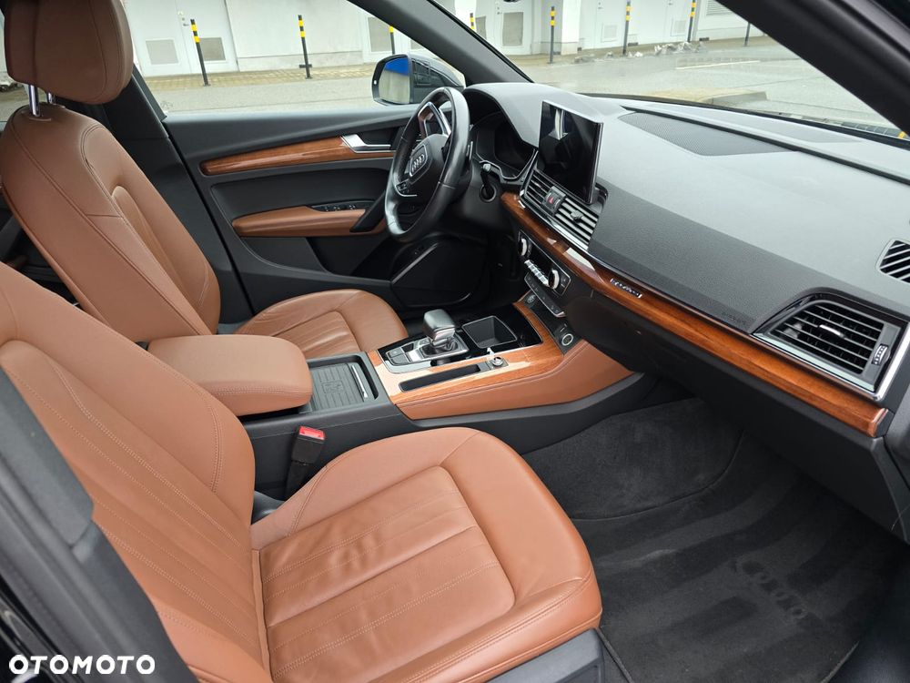 Audi Q5 2.0 TFSI Quattro w wersji Premium Plus z piękną brązową skórą i drewnem na kokpicie.