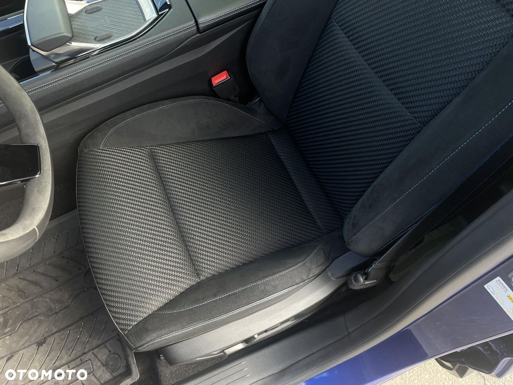 Tapicerka materiałowa łączona z elementami Alcantary czarnaz niebieskimi przeszyciami