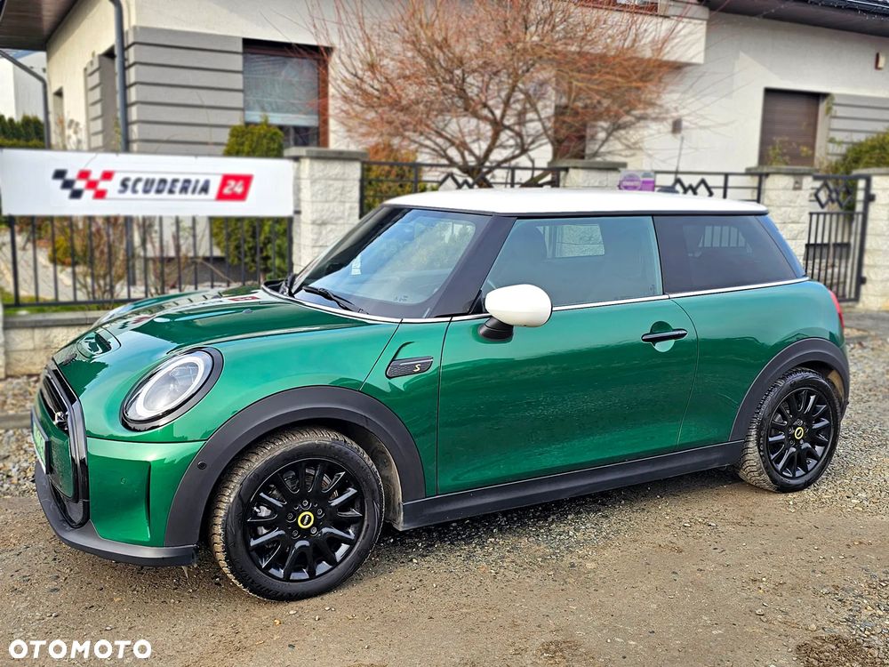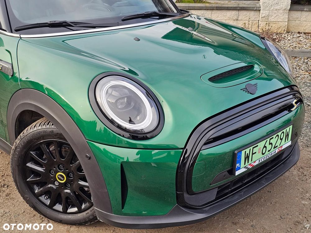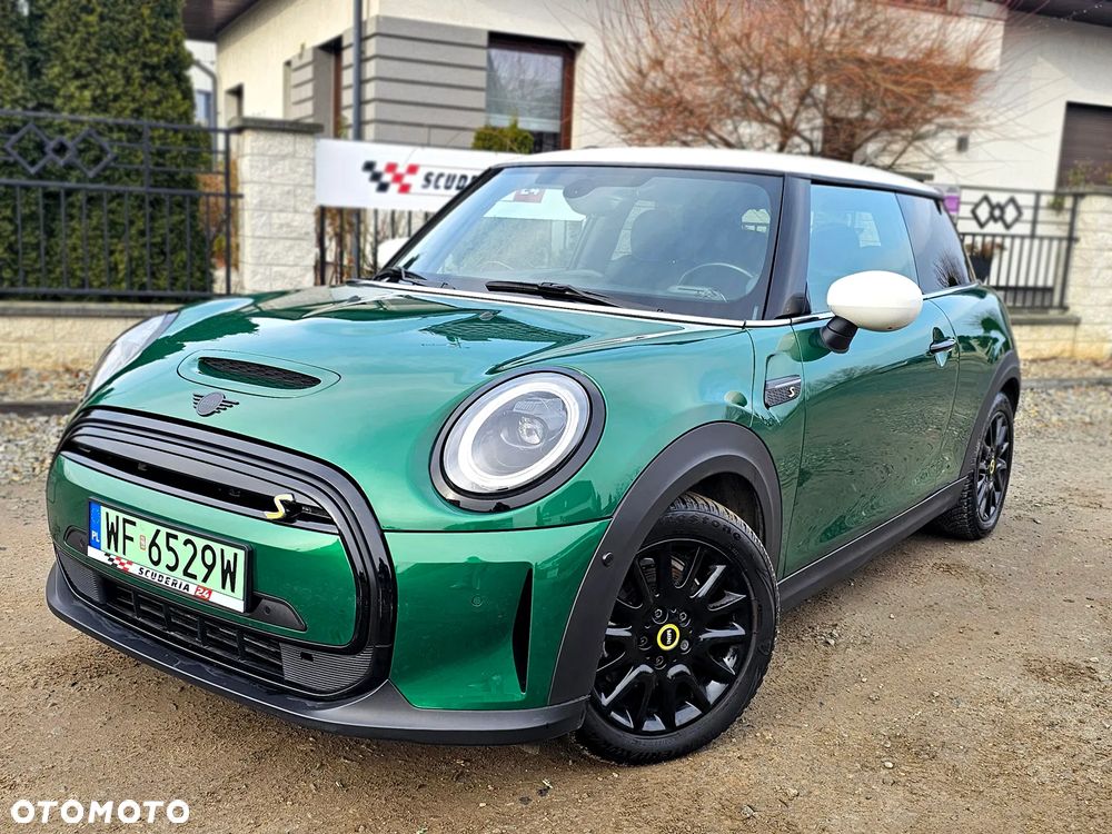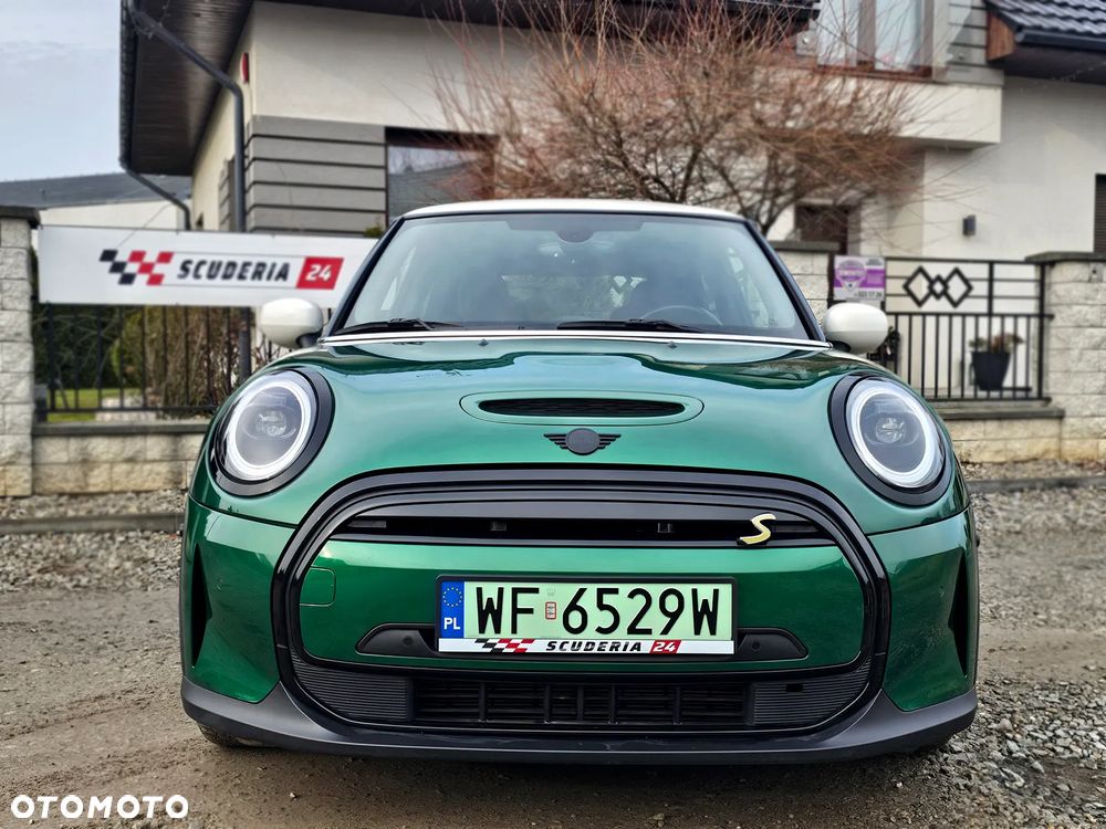 Mini Cooper S, elektryczny, wersja sportowa 184 KM, kolor metalik British Racing Green IV z białymi lusterkami i dachem oraz czarno-żółtymi dodatkami.