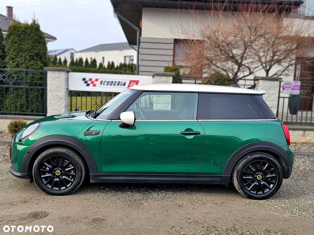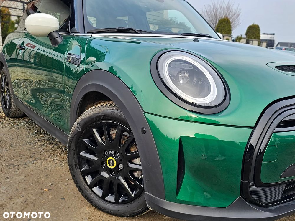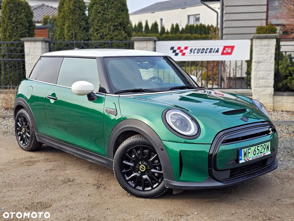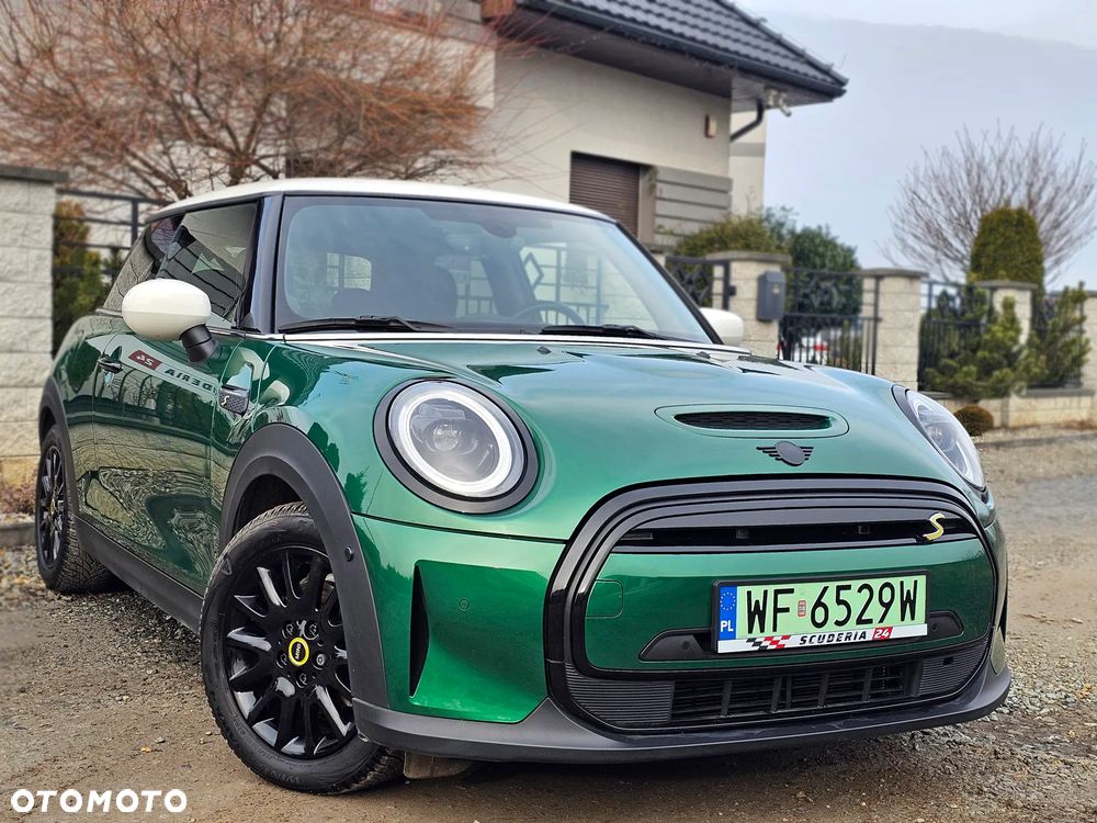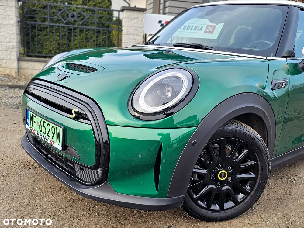 Mini Cooper S, elektryczny, wersja sportowa 184 KM, kolor metalik British Racing Green IV z białymi lusterkami i dachem oraz czarno-żółtymi dodatkami.