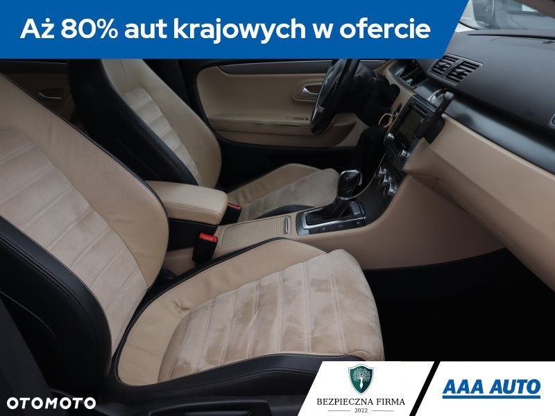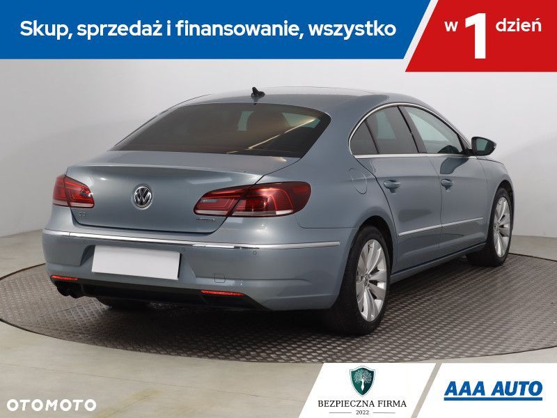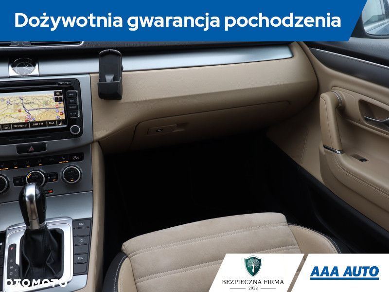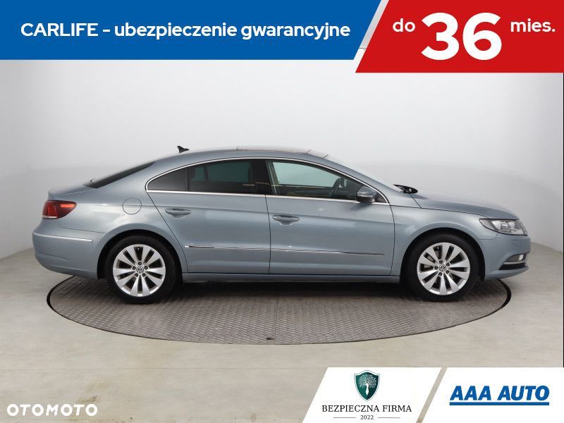 Ten Volkswagen CC jest wyposażony w mocny silnik benzynowy 1.4 TSI o pojemności 1390 cm3 i mocy 160 KM. Samochód posiada automatyczną skrzynię biegów, co zapewnia płynną i komfortową jazdę. Wśród wyposażenia znajdziemy panoramiczny dach, który dodaje przestronności wnętrzu. Reflektory bi-ksenonowe poprawiają widoczność w nocy. Fotele są półskórzane, wykończone alcantarą, sportowe i podgrzewane, co zwiększa komfort podróży. Dodatkowo, przednia szyba jest podgrzewana, a klimatyzacja automatyczna, co ułatwia utrzymanie odpowiedniej temperatury w kabinie.