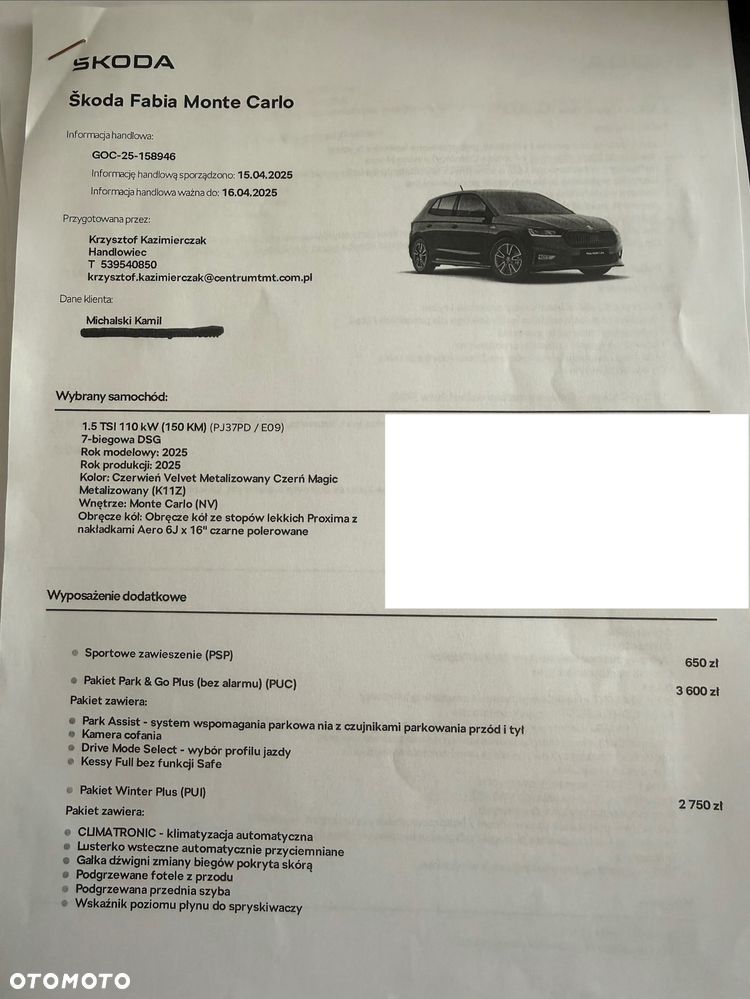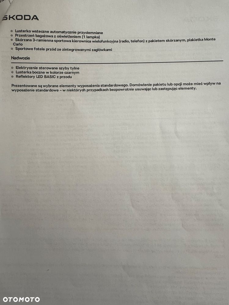Na sprzedaż oferuję praktycznie nową Škodę Fabię Monte Carlo z mocnym i dynamicznym silnikiem 1.5 TSI (150 KM) oraz automatyczną skrzynią DSG. Auto z 2025 roku, bardzo bogato wyposażone, w świetnym stanie wizualnym i technicznym.